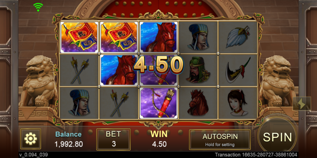 | Special Features | ● 5 reels and 3 rows with 25 paylines. ● Special Battle of Red Cliff mode, greatly improved chances to get Free Games and All-of-a-Kind prizes. ● The more you play the higher the multiplier in Free Games. |